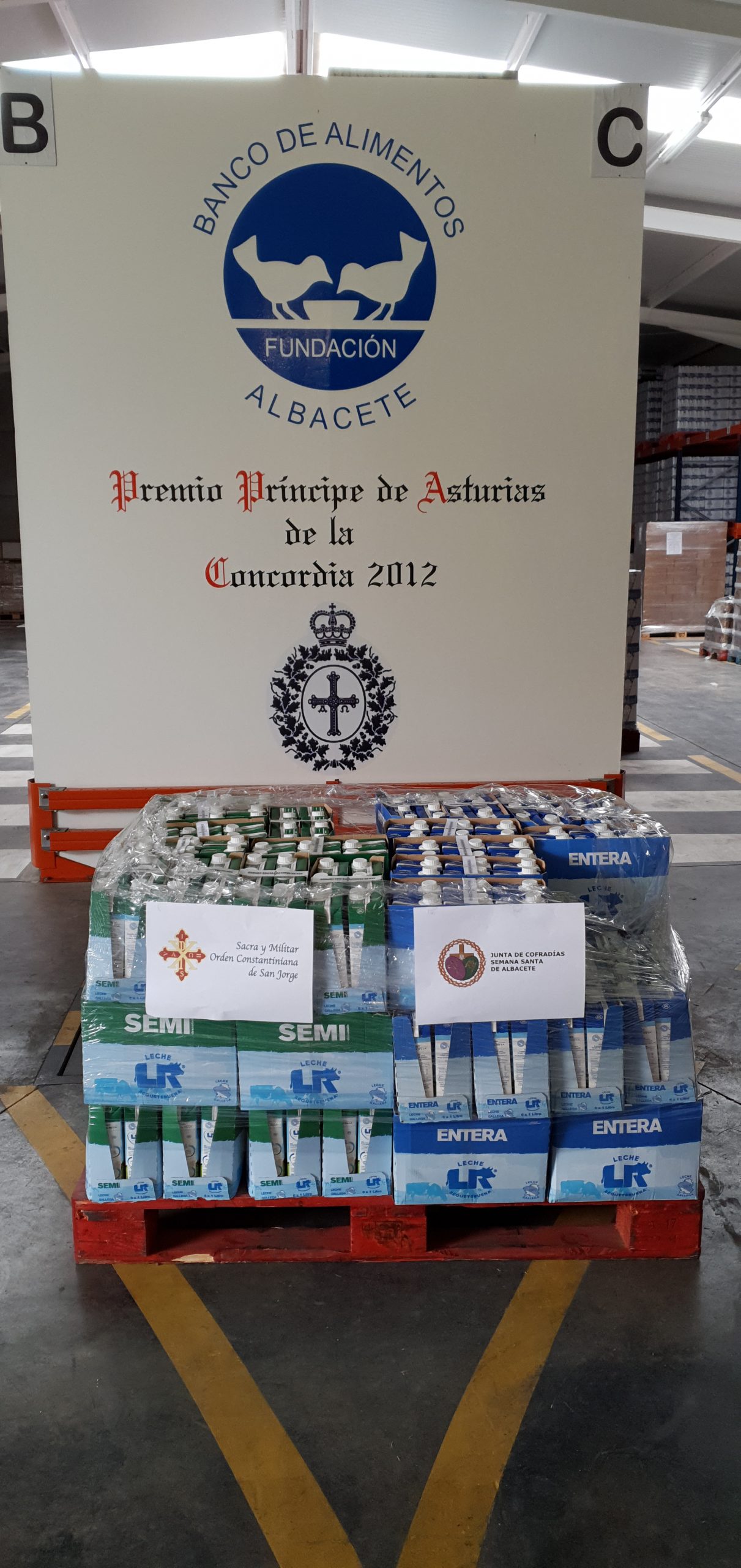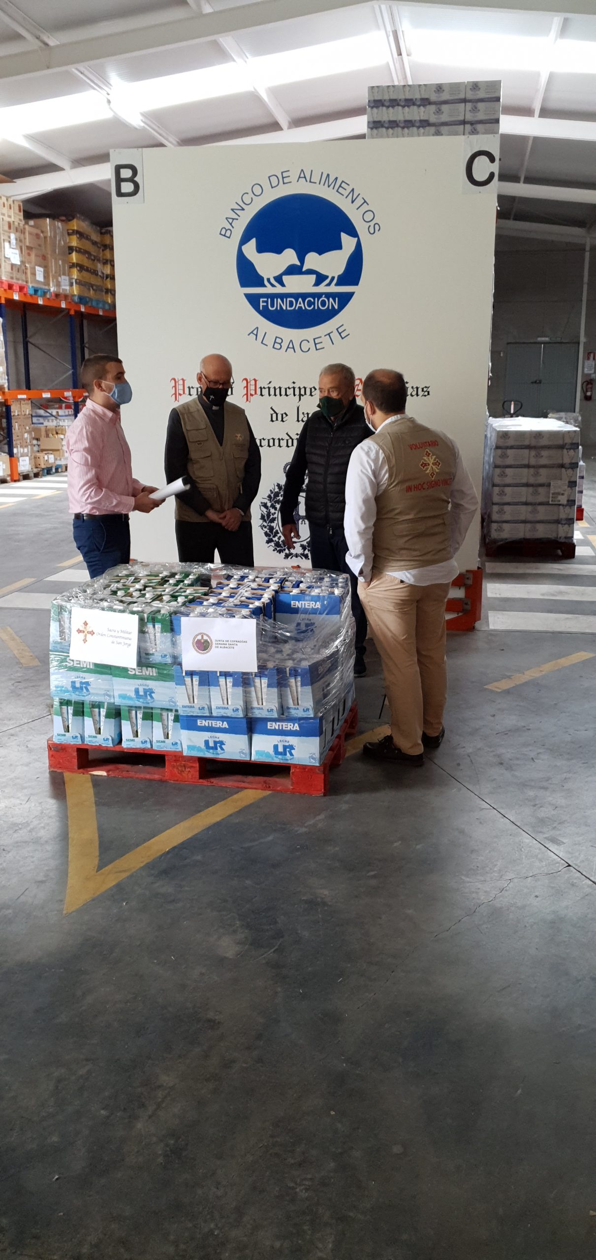 La delegación de la Orden Constantiniana en Castilla-La Mancha y el antiguo Reino de Murcia, en colaboración con la Junta de Cofradías de la Semana Santa de Albacete, ha realizado una entrega de 400 litros de leche al Banco de Alimentos de Albacete. Esta acción surge de una iniciativa puesta en marcha por la Junta de Cofradías respondiendo a la grave situación social derivada de la pandemia de la Covid-19.