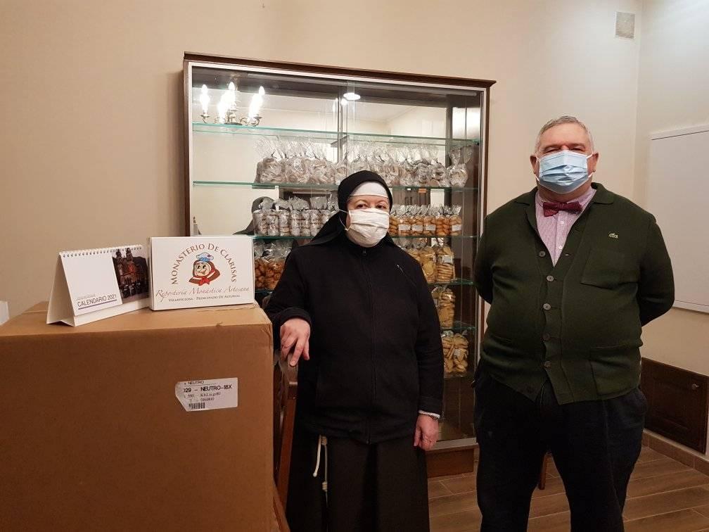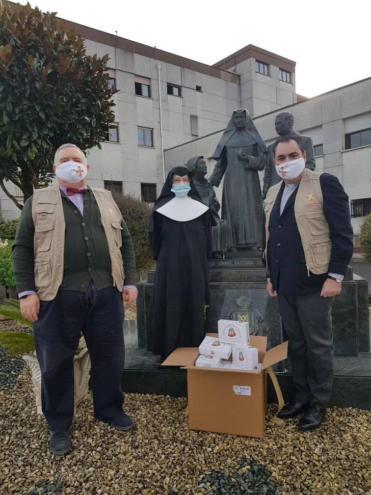 En la mañana del viernes 18 de diciembre, varios miembros de la Delegación del Cantábrico se desplazaron al Convento de las Hermanas Clarisas de Villaviciosa, que no pasan un buen momento económico debido a los confinamientos. Allí recogieron 34 cajas de pastas que previamente habían encargado.