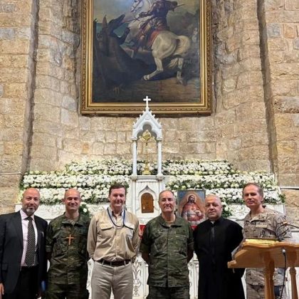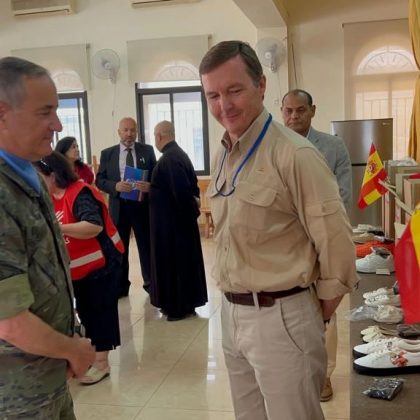 Nuestro Gran Maestre empezó visitando el monumento de Nuestra Señora de Haramoun para posteriormente participar en la entrega de calzado donado por TEMPE Grupo Inditex en Cáritas de Kleyaa. Los beneficiarios se sorprendieron de la calidad y comodidad del calzado y lo agradecieron enormemente. A continuación, tuvo la oportunidad de conocer la Iglesia de San Jorge y comprobar la devoción a este Santo en todo el llamado “Corredor Cristiano”, una pequeña alineación de poblaciones cristianas en un entorno chiíta. Hicieron un alto en la carretera de El Khiam, donde tuvo lugar en 2007 el atentado donde fallecieron seis paracaidistas españoles; y allí fue donde los recordaron con una bonita oración.