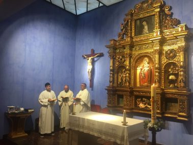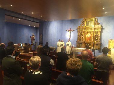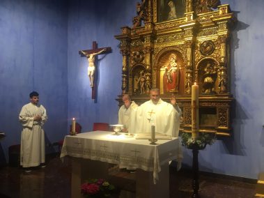 A las 20:00 h se dio paso a la celebración de una liturgia, presidida por su Rector Magnífico, el Excmo. Sr. D. Francisco Javier Pérez Mas, acompañada de los seminaristas que están alojados en la residencia, donde se tuvo especial atención en las preces por los caballeros y damas de la Orden Constantiniana de San Jorge. Tras la misma, los componentes de la delegación de Aragón se reunieron en el patio del centro junto con los seminaristas y tuvo lugar la tradicional foto de familia.