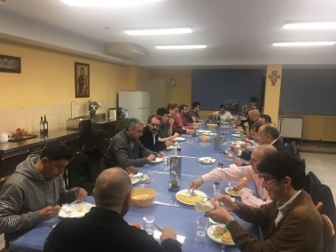 A continuación, los miembros de la Orden y los alumnos del centro disfrutaron de una cena y una velada estupenda ofrecida por el seminario, donde se compartieron los alimentos y se conversó de muchos aspectos relacionados con la vida seminarista, religiosa y la vocación de ellos mismos junto con la misión y actividades que la Orden Constantiniana participa en la sociedad. Al finalizar la cena, se trasladaron a un salón anexo, donde el delegado de Aragón, el Excmo. Sr. Dr. D. Juan Luis Doncel y Paredes inició la sobremesa con una interesante tertulia sobre el origen de las «órdenes militares», acompañada de aportaciones de otros caballeros y comentarios de otros seminaristas. Se dio por concluida la visita al Seminario Metropolitano de Zaragoza y compartida la celebración de San Jorge junto con los alumnos en una jornada cargada de historias, experiencias y convivencia.