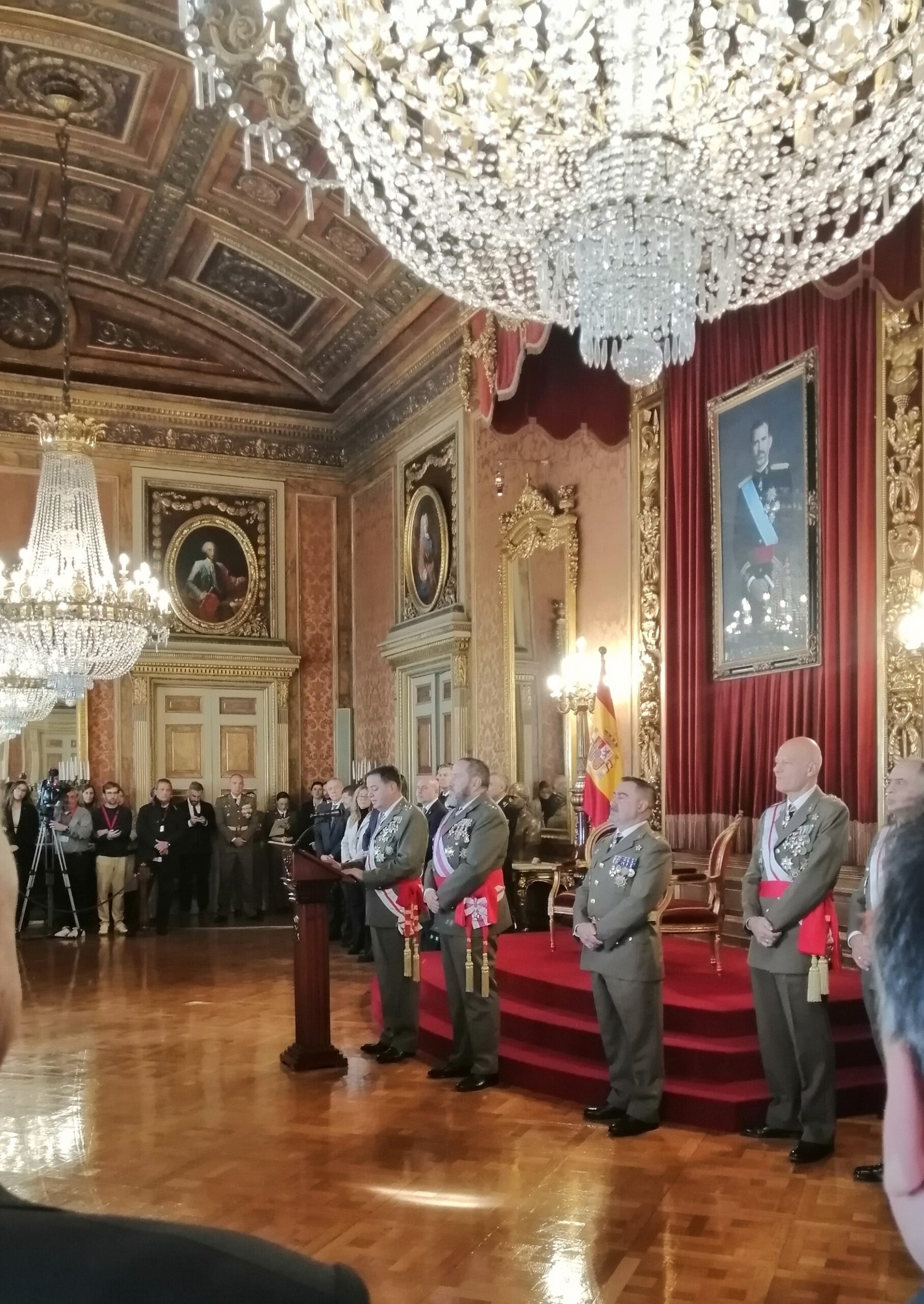 Los actos se han iniciado con los honores de ordenanza previstos al Teniente General en el claustro del Palacio; a continuación en el Salón del Trono ha tenido lugar la imposición de condecoraciones y el parlamento en el que el Inspector General del Ejército ha realizado un balance de las operaciones realizadas por los tres ejércitos durante el año anterior y ha expuesto las líneas de acción que se desarrollarán en el que comienza. Al finalizar el acto se ha brindado por España y por Su Majestad El Rey.