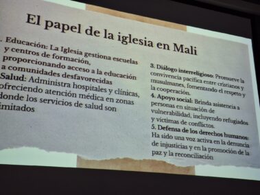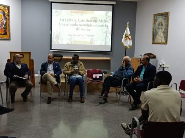 Bajo el título : “La Iglesia Católica en Mali. Una mirada nostálgica desde la distancia” ,Daniel ofrece una panorámica de los católicos en su país, donde sólo representan el 2 % de la población, si bien son respetados por la mayoría islámica. Mali es un país aconfesional , que votó en referéndum para decidir que no se constituyera una república islámica. A continuación, contó su llegada a España, su formación, su experiencia religiosa y como se ha desarrollado su vida entre los dos países, siempre de la mano de los salesianos, e inspirado por un espíritu que nunca se rinde.
