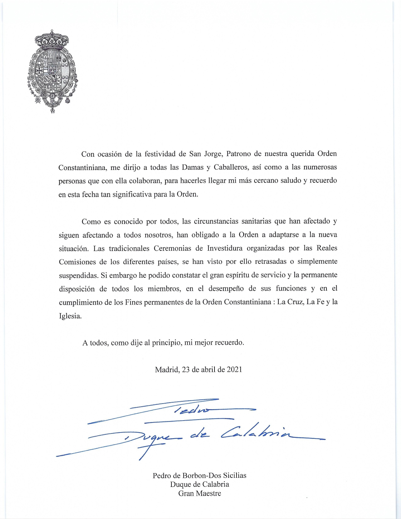 Felicitación del Gran Maestre – ESPAÑOL