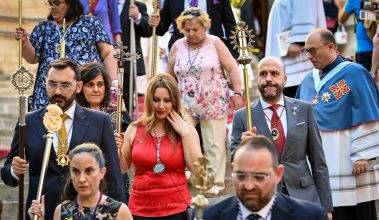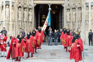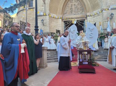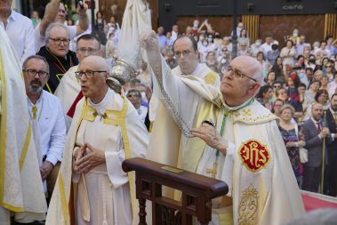 La solemne procesión eucarística del Corpus Christi recorrió las calles del centro histórico de la capital valenciana, con salida desde la Puerta de los Apóstoles de la Catedral.