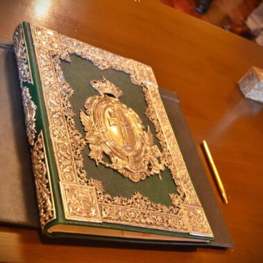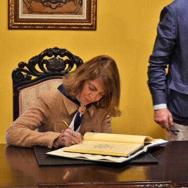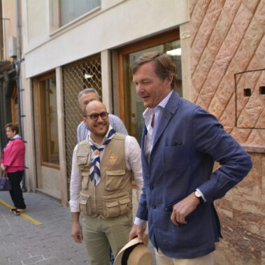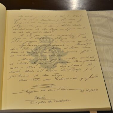 Tras realizar la estación jubilar en la Iglesia El Salvador, la comitiva se desplazó hasta la Basílica, donde fueron recibidos por Monseñor Lorca Planes, obispo de la diócesis de Cartagena, el rector de la basílica, D. Emilio Sánchez y las autoridades eclesiásticas la basílica. Desde allí SS.AA.RR. Don Pedro de Borbón y Doña Sofia Landaluce, acompañados por los miembros de la Orden Constantiniana y la Real e Ilustre Cofradía de la Santísima y Vera Cruz de Caravaca, se desplazaron hasta la Torre Chacona donde firmaron en el libro de Honor de la cofradía. El hermano mayor. D. Luis Melgarejo Armada regaló una réplica de la cruz de madera que portó Santa Teresa en su hábito a los Duques de Calabria. Seguidamente se realizaron las intervenciones institucionales y se brindó con un vino dulce y con las conocidas Yemas de Caravaca de la cruz.