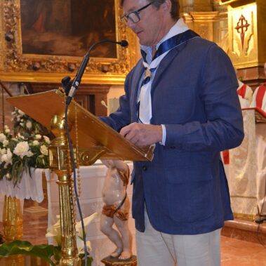 Finalizados los saludos, se procedió a realizar la estación jubilar presidida por el vicario episcopal de la zona D. David Martínez Robles, acompañado del Ilmo. Sr. D. Luis Enrique Martínez y Galera, prior de la delegación de Castilla-La Mancha y Murcia. A lo largo de la misma, se realizó el rito de dicha estación jubilar y se bendijeron a los peregrinos. Antes de finalizar, el Duque de Calabria tomó la palabra y puso de manifiesto que «los caballeros, damas y eclesiásticos de la orden participamos en la vida religiosa dentro de nuestro ámbito geográfico y diocesano, tanto en el plano espiritual como en el litúrgico, dando cumplimiento de uno de los fines fundacionales de nuestra querida orden». En este sentido, destacó que «estar hoy en Caravaca de la Cruz es una ocasión extraordinaria que nos permite renovar nuestra vida cristiana y dar testimonio de nuestra fe. Ese es el compromiso que adquirimos el día que entramos a formar parte de la orden». También recordó las palabras del papa Francisco en su invitación a venir a Caravaca en este Año Jubilar, «supondrá entrar en el misterio del amor que nos ha ofrecido Jesucristo, vamos a Caravaca para participar en la misericordia y el perdón de Dios».