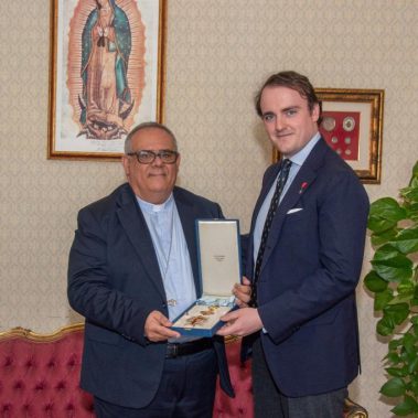 Al final, el príncipe Jaime entregó a Monseñor Rumeo un precioso escudo del Obispo de Noto pintado a mano con la Gran Cruz Constantiniana pendiente, en señal del alto honor que se le otorga.